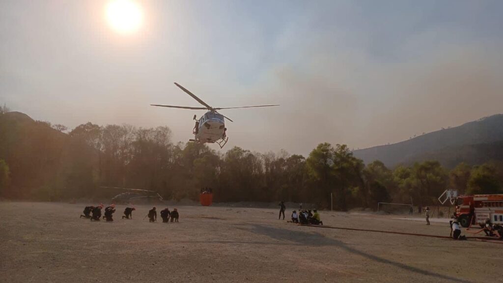 🚁Un helicóptero apoya con más de 30 descargas de 150 galones de agua para sofocar el incendio.