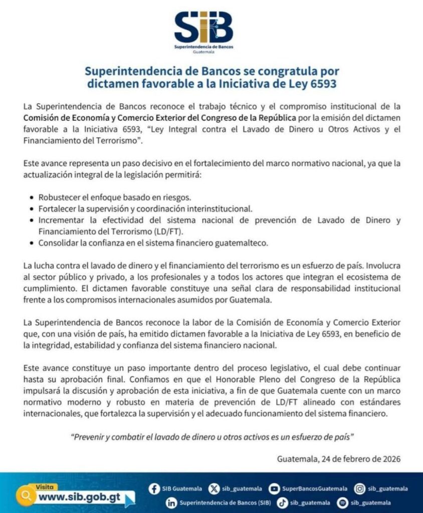 En comunicado emitido por La Superintendencia de Bancos (SIB). la entidad manifestado su respaldo al dictamen aprobado de manera favorable por la Comisión de Economía y Comercio Exterior del Congreso de la República, correspondiente a la Iniciativa de Ley 6593, denominada Ley Integral contra el Lavado de Dinero u Otros Activos y el Financiamiento del Terrorismo.